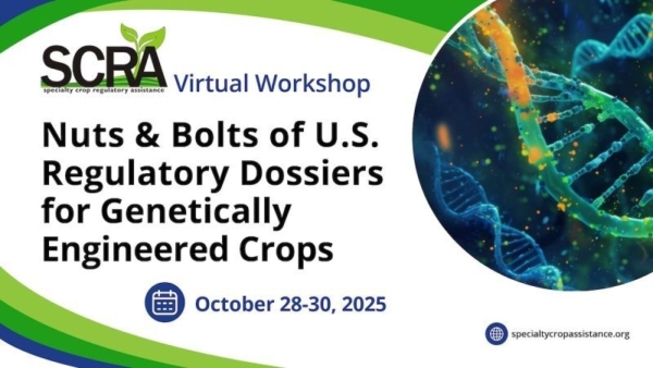 The Specialty Crops Regulatory Assistance (SCRA) will be hosting a virtual Zoom workshop on October 28-30, 2025. This interactive, three-day workshop offers a unique opportunity for developers of genetically engineered crops to learn directly from USDA-APHIS, EPA, and FDA officials about the practical aspects of regulatory dossier development.
