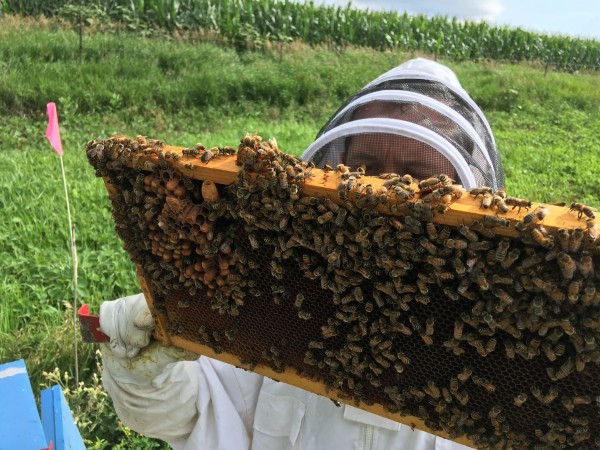 Graduate student Shane Stiles checks a rack from one of the honeybee hives placed near Brassica carinata plots as part of a South Dakota State University research project that examined the ecosystem services pollinators provide in an agricultural context. (Photo by Henning Nottebrock)
