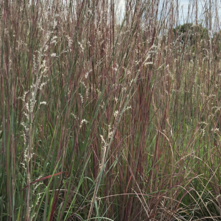 Little bluestem (foreground) and big bluestem (background), the dominant grasses of the tallgrass prairie, are distant relatives of sorghum. Photo taken at the reconstructed prairie at the Donald Danforth Plant Science Center, St. Louis, MO. (Elizabeth Kellogg)