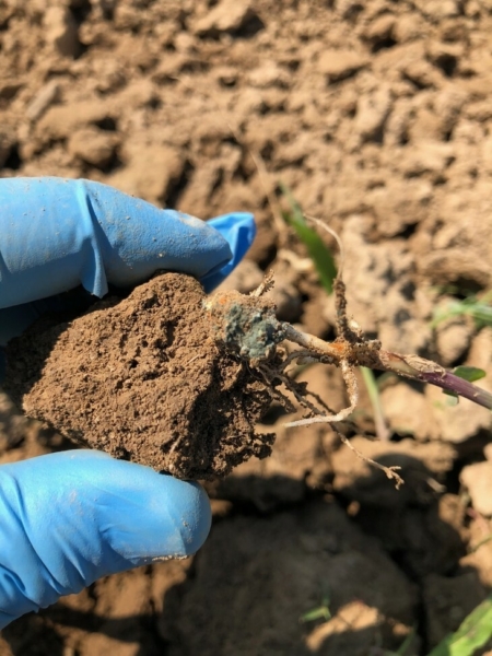 Metarhizium robertsii is shown colonizing small sections of corn plant roots. The fungus provides benefits to the host plant.