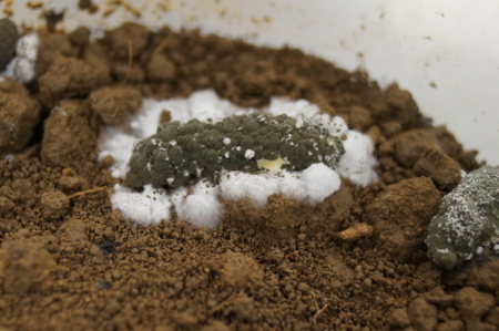 Penn State researchers knew the Metarhizium robertsii fungus was deadly to insects such as caterpillars on the ground (victim shown here), but they became more interested when they learned it was taken up by plant roots. Turns out, the fungus boosts both plant growth and plant defenses against pests. (Nick Sloff photo)