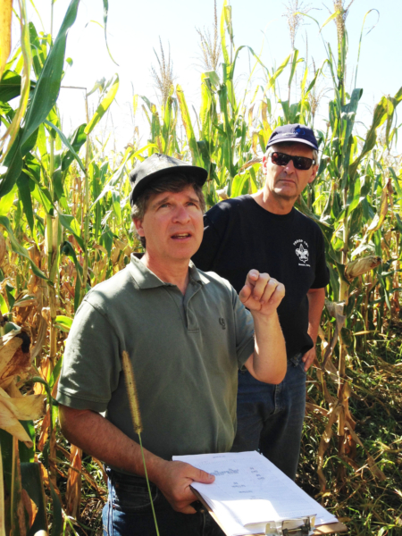 Paul Scott, left, and Thomas Lübberstedt, inspect a corn nursery near Ames during harvest. The scientists are working to develop improved seed corn tailored to the needs of the organic industry. (Photo by Kathleen Delate, Iowa State University)