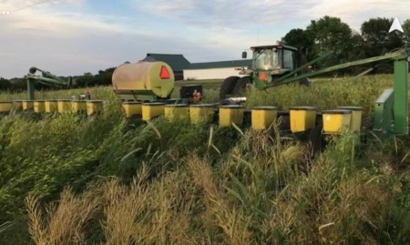 Andrew Reuschel of Reuschel Farms in Ill., uses 1986 Kenzie 2600 and 1993 John Deere planters with double discs and two press wheels to plant green. As long as the cover crop is green at planting, these planters will cut through it like butter, he says. (Photo courtesy of Andrew Reuschel)