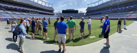 Attendees at the NSTA Annual Meeting on July 21 toured Empower Field at Mile High, where they met with Turf Technician Abe Picaso to talk about the natural grass playing surface. (Chris Lusvardi photo)