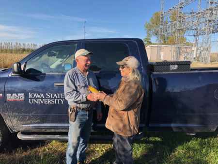 Tom Frantzen, an organic farmer from Alta Vista, discusses organic corn varieties with Kathleen Delate, professor of horticulture and agronomy. Delate is part of a research team developing new corn varieties for organic production. (Image courtesy of Kathleen Delate)